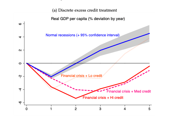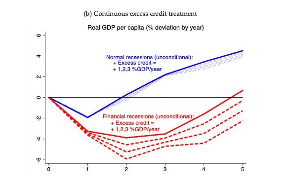I studied a research report named “When Credit Bites Back: Jordà, Schularick, and Taylor (2013)” where they examine the effects of excess credit. When they examined 154 business cycles in 14 advanced economies, their findings stated that financial crisis recessions- which are worse than normal recessions—are closely related to the credit intensity of expansion.