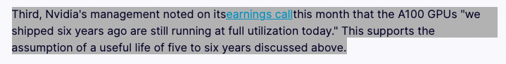 But guess what? The NVIDIA CFO defended that the A100 GPUs that were shipped six years ago are still running at full utilisation.